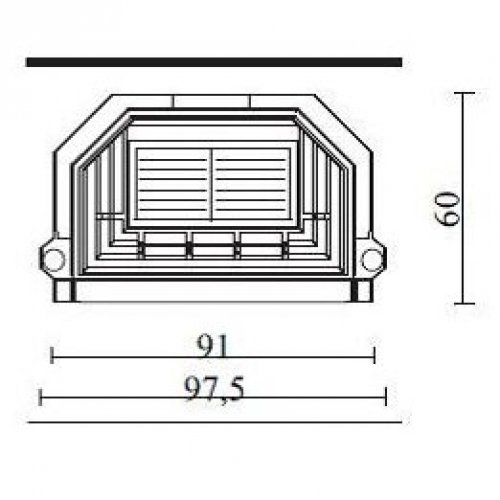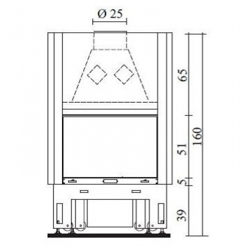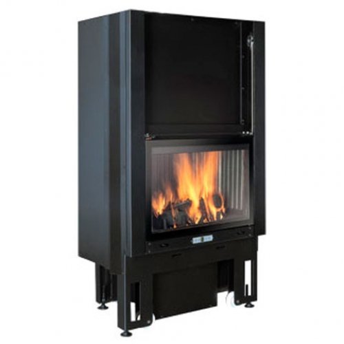 Закрытая топка, металлическая структура, окрашенная в темно-серый цвет. Дверца с плоским витрокерамическим стеклом. В верхней части короба топки предусмотрены 4 отверстия для подключения набора разводки горячего воздуха. Топка укомплектована системой двойного дожига.
