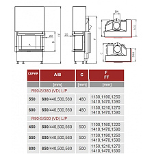 Угловая каминная топка с Г-образным стеклом. Боковое стекло справа. Топочная камера футерована шамотом. Подъёмный механизм двери (система Easy-Lift). Ширина дверки 467+807 мм. Высота дверки 544 мм. Возможно подключение воздуха извне.